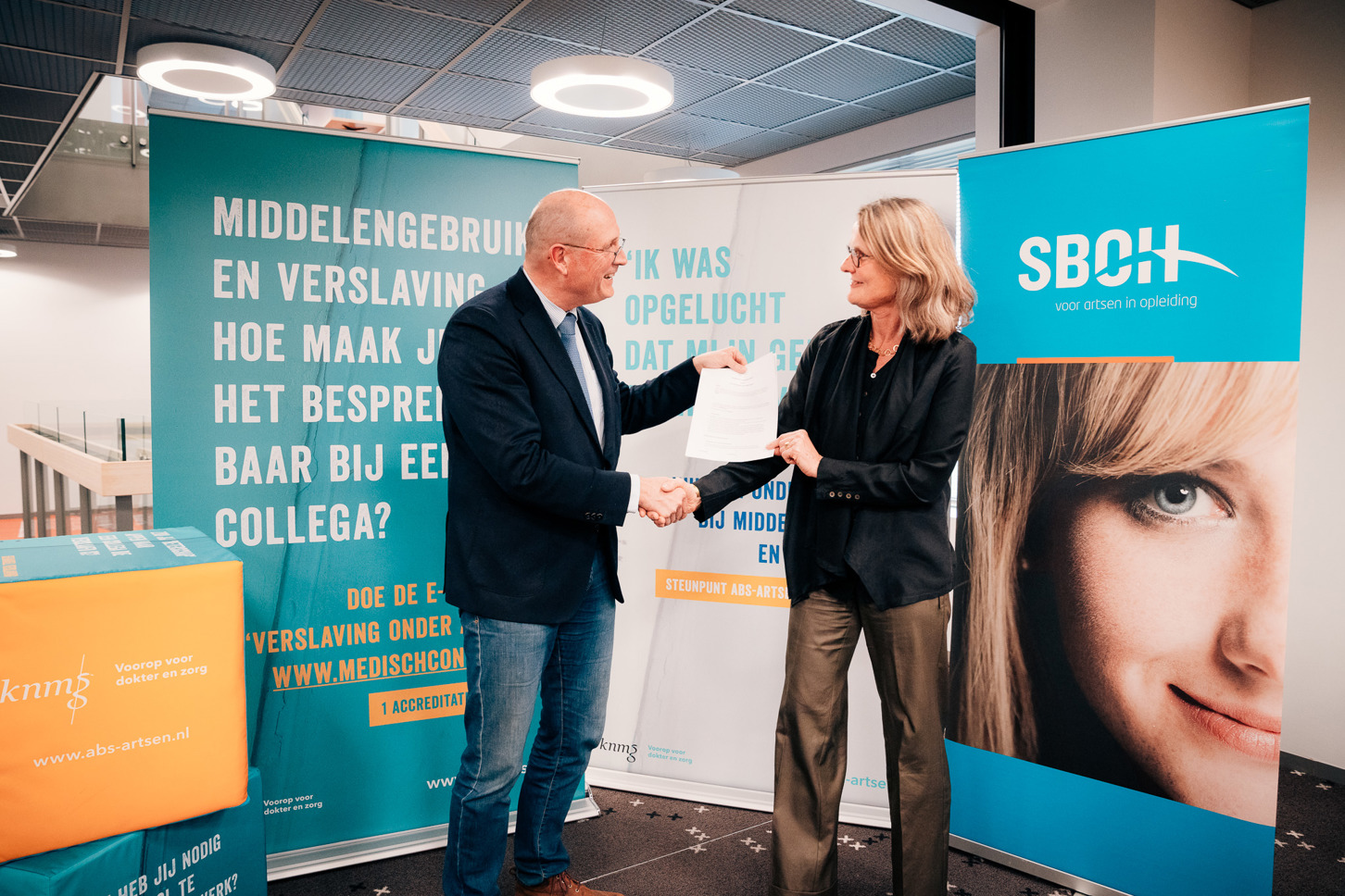 Astraia Rühl, algemeen directeur KNMG en Kees Esser, voorzitter Raad van Bestuur SBOH bekrachtigen met een handdruk de overeenkomst waarin SBOH aan KNMG financiële ondersteuning toezegt voor het ABS-steunpunt voor artsen.
