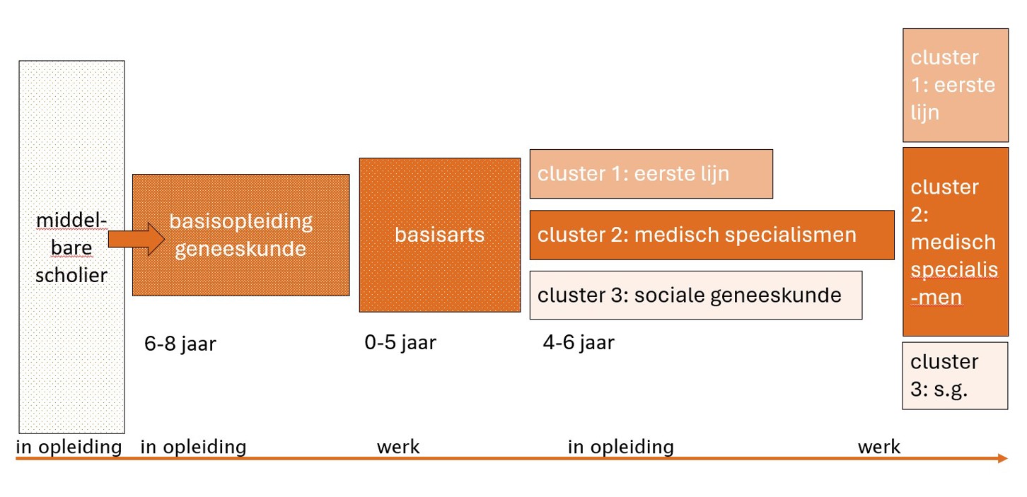 Onderstaand schema laat het opleidingspad zien van een middelbare scholier vanaf de instroom in de basisopleiding geneeskunde tot en met het werken als geneeskundig specialist. Afgestudeerde geneeskundestudenten kunnen een periode werken als basisarts voordat zij een medische vervolgopleiding kiezen. Niet alle basisartsen kiezen trouwens voor een vervolgopleiding.